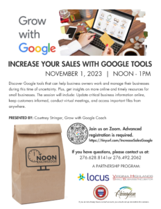 November 1, 2023 @ 12:00 pm - 1:00 pm Google Series: Increase Your Sales with Google Tools ZOOM MEETING VA