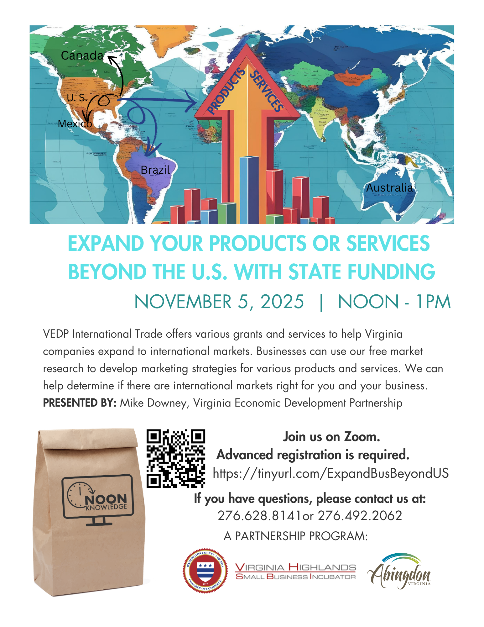 November 5 @ 12:00 pm - 1:00 pm Noon Knowledge: Expand Your Products or Services Beyond the U.S. with State Funding